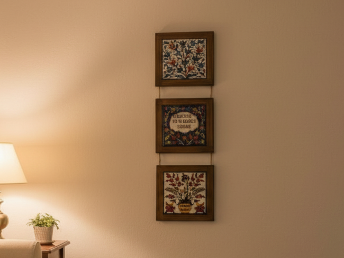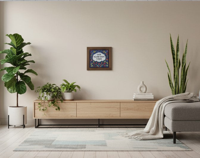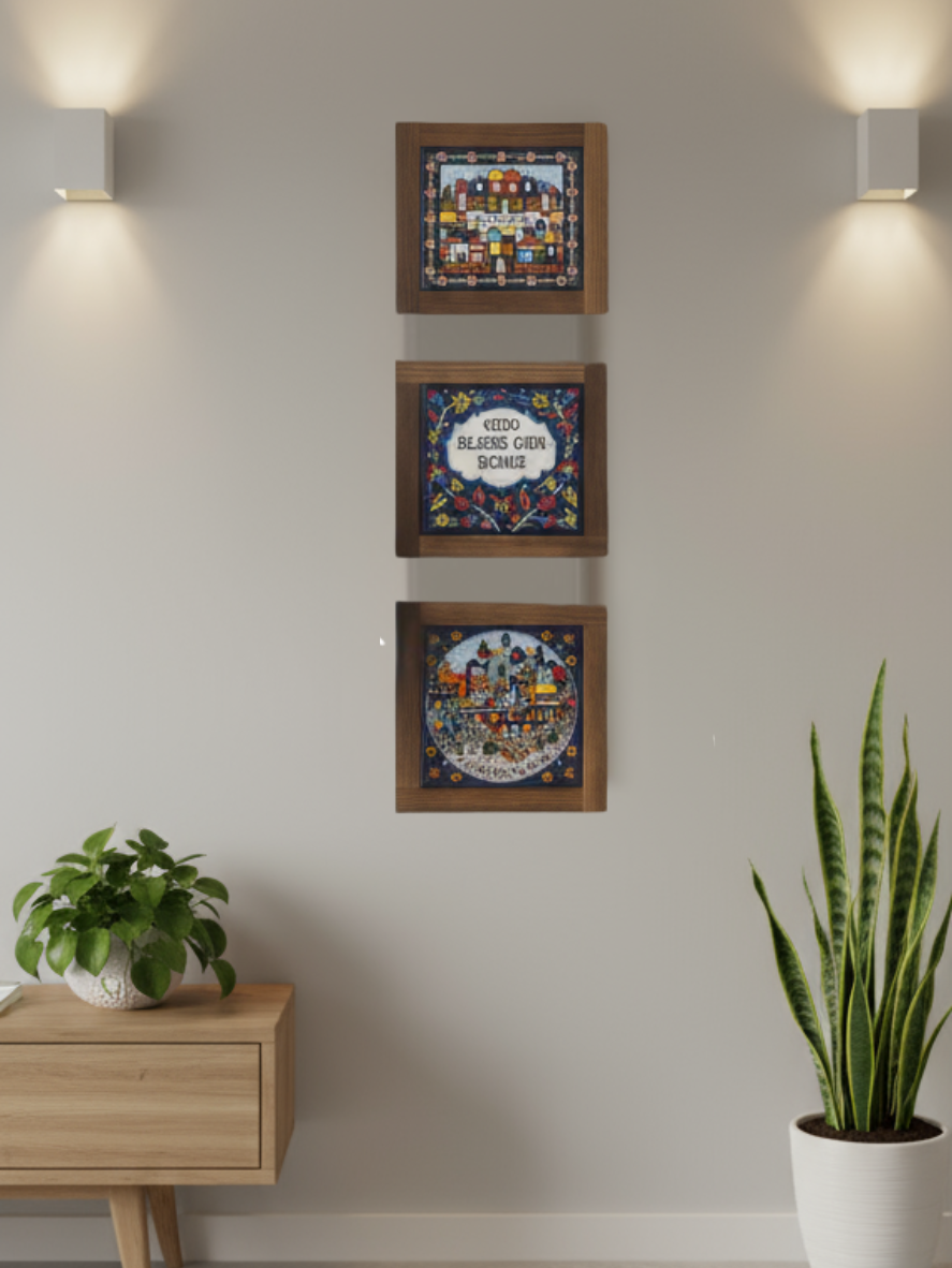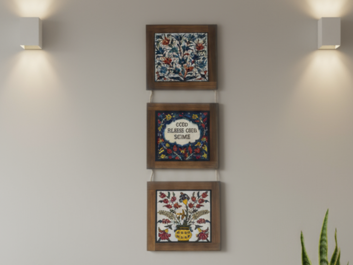 Palestinian Hand-Painted Ceramic Wall Art with Olive Wood Frame