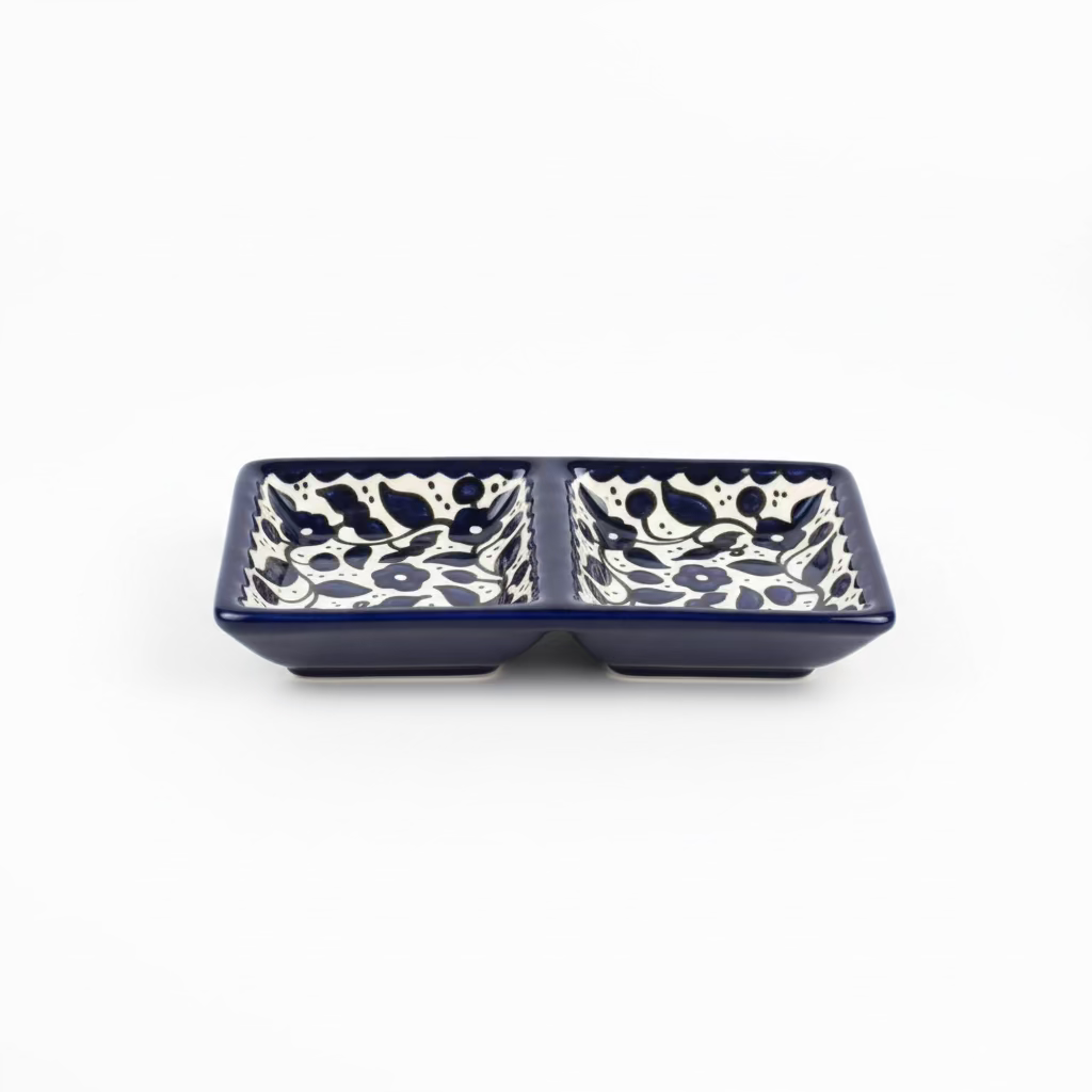 Handcrafted in Hebron, Palestine, this dual appetizer plate brings together thoughtful design and everyday function. Hand-painted by skilled artisans, each piece carries intricate patterns that reflect the region’s long ceramic tradition.