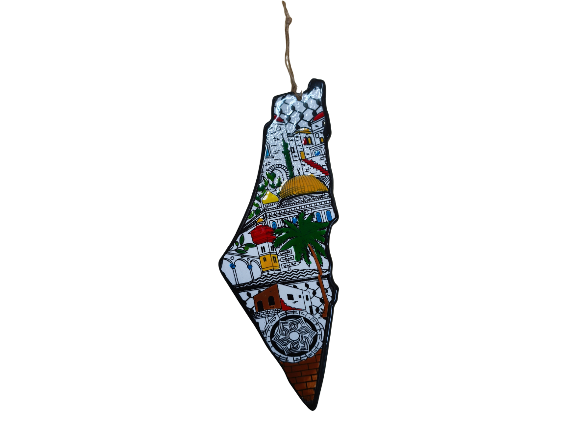 Shop authentic Palestinian artistry and heritage with this handcrafted ceramic map of Palestine, featuring intricate hand-painted designs and traditional motifs. Made in Hebron, Palestine, each map is shaped, painted, and glazed by skilled artisans, creating a stunning decorative accent for any space.